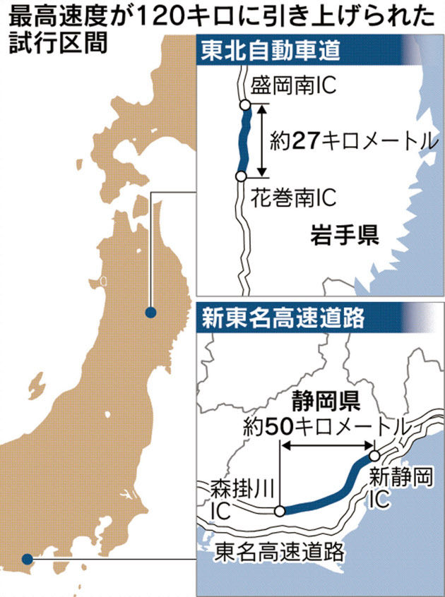 試行の対象は新東名の新静岡インターチェンジ(IC)―森掛川IC間(約50キロ)と、東北道の花巻南IC―盛岡南IC(約27キロ)の2区間。事故の発生状況や季節ごとの交通状況の変化による影響も含めた分析をするため、少なくとも1年間は試行を続ける。