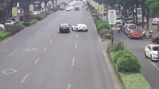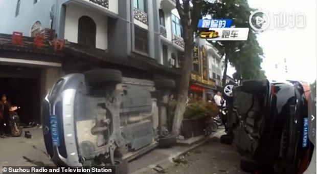 この事故により黒の乗用車は道路から押し出されさらに道端に駐車されていた灰色の乗用車とスクーター2台まで巻き込んだ。